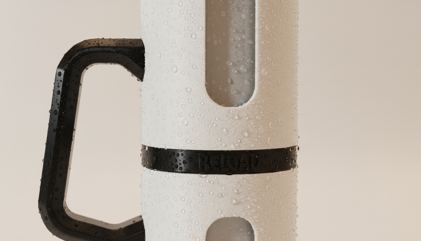 Primeiro, você carrega a Reload com até duas bebidas ao mesmo tempo. Quando a bebida de cima acaba, é só inserir uma nova pela parte de baixo. O sistema faz o resto: a lata vazia é automaticamente ejetada, enquanto a nova sobe para a posição de uso.